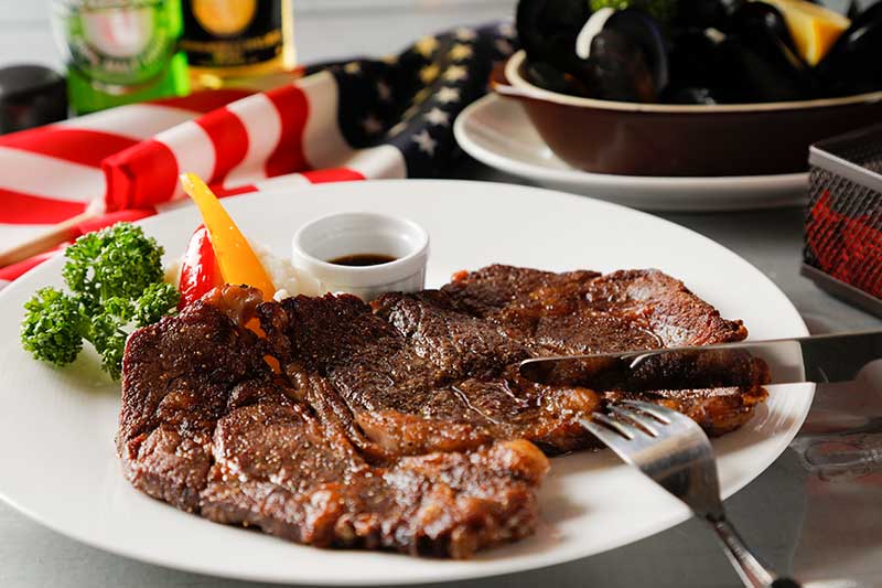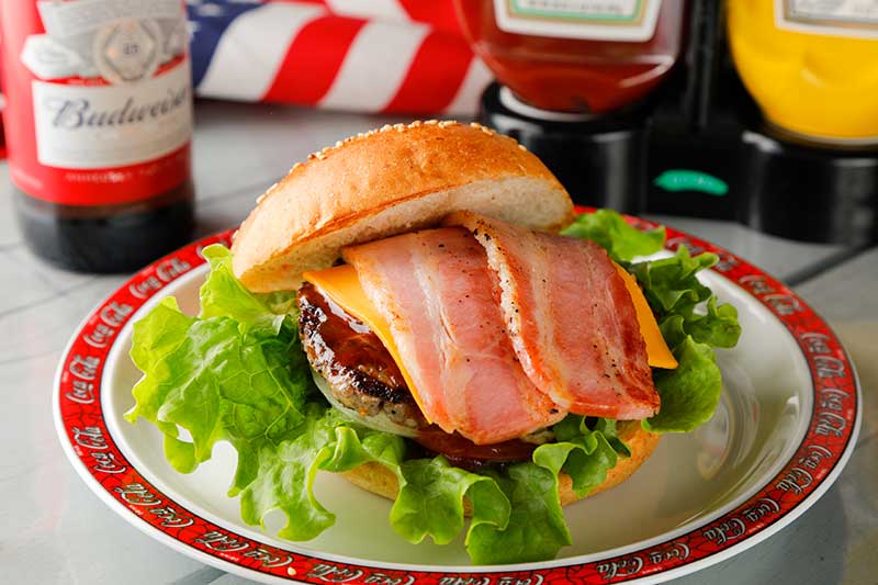 当店のはお薦めは、やはりハンバーガー。自家製酵母による全粒粉のバンズを使っており、パティも牛肉100%。通常のハンバーガーよりサイズも大きく、食べ応えいっぱいです。ハンバーガーは10種類以上あり、ぜひいろんな種類を食べ比べてみてください。また夜メニューはお酒が進む、ダイナー料理が充実。お肉やシーフード料理、サラダ、ポテトなどのサイドメニューなど40種以上のメニュー構成で、横丁内でアメリカ気分を満喫!カクテル、バーボンなどのお酒メニューも豊富に取り揃えております。